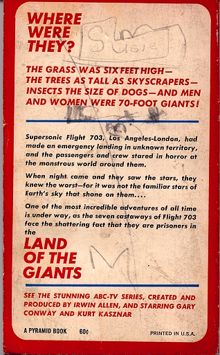 Ergo, here we have an outstanding artifact of Science Fiction's "Brass" age: a First (and probably only) printing of a 156-page novella written by authentic Golden Age great Murray Leinster, credited as being based on the series created by Irwin Allen, but quite possibly based on one of Leinster's own screenplays as he was a prolific scriptwriter who worked under a variety of pseudonyms. The book is not exactly museum quality; in 1968 the concept of using acid-free paper in a 60-cent paperback was not even a dream, so the pages have turned a nice, crispy tan the color and texture of perfectly toasted Wonder Bread. Also, as you can see from the larger scans of the front and back covers, sometime in the intervening years a young lady named "Susie" chose to decorate the covers (but luckily, not the interior) with pencil. Still, as a kitschy relic of what life was like before the market ascendance of Star Wars and Star Trek, this one is hard to beat. SOLD OUT